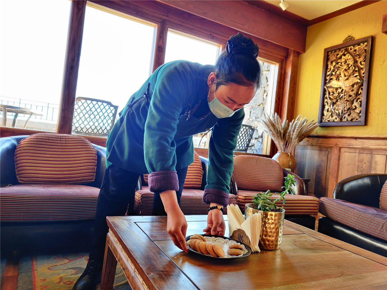 在香格里拉市的松赞林卡酒店,23岁的藏族姑娘鲁茸追玛正在为客人做西餐。“受新冠肺炎疫情影响,最近一段时间入住的客人不是很多。我要做的就是让客人在最短的时间吃上最热乎的饭菜。”她说。