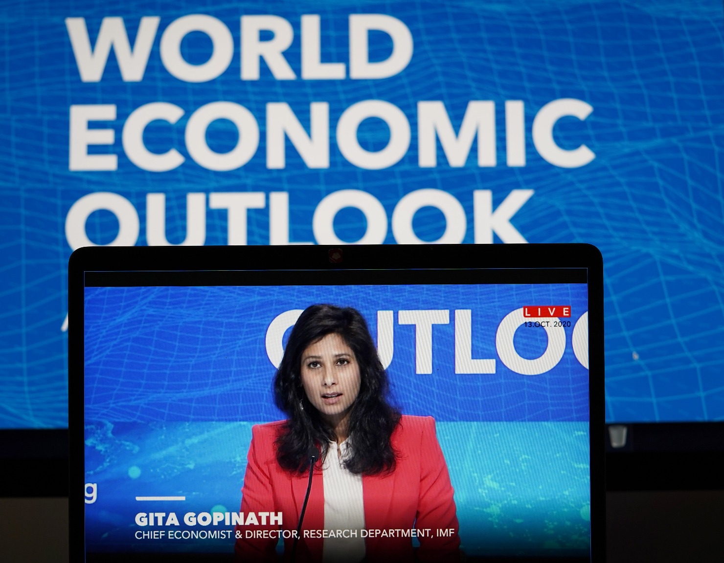 2020年10月13日,在美国首都华盛顿,国际货币基金组织首席经济学家吉塔·戈皮纳特出席视频新闻发布会。(新华社记者刘杰摄)