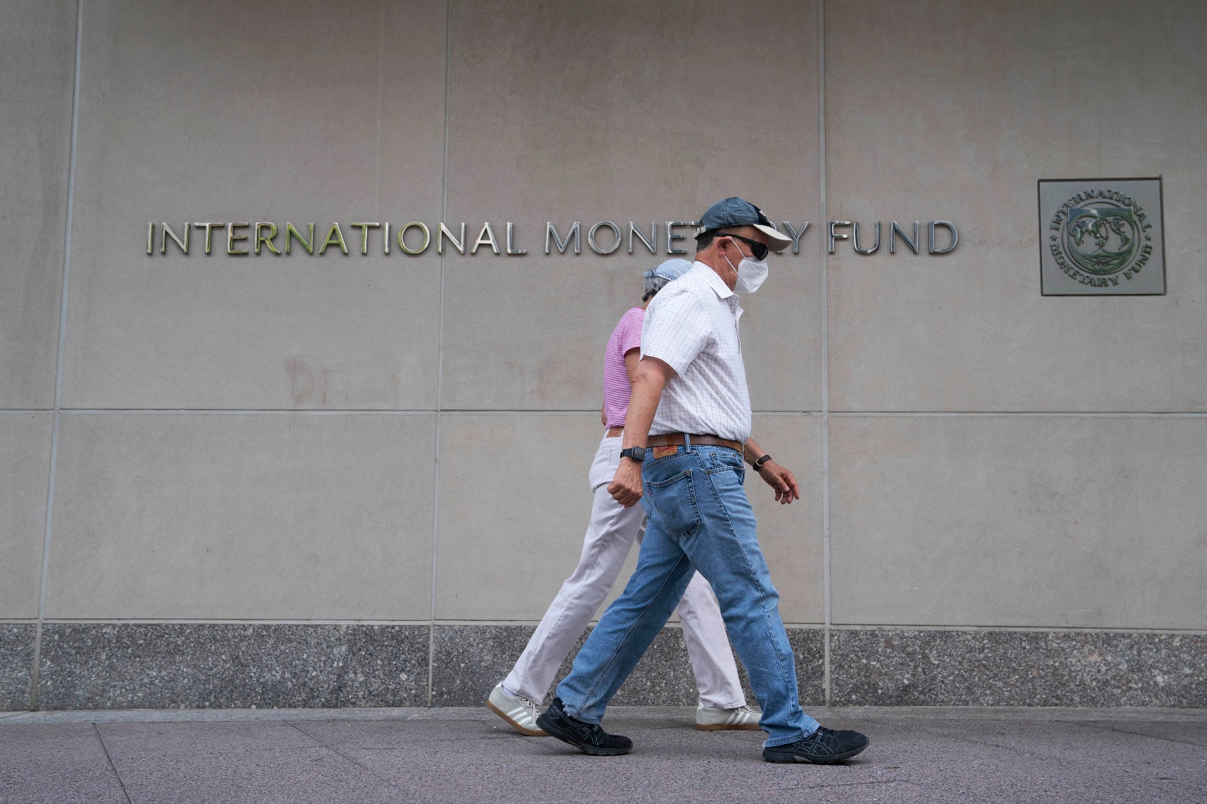 2020年7月17日,在美国首都华盛顿,行人从国际货币基金组织总部大楼前经过。(新华社记者刘杰摄)
