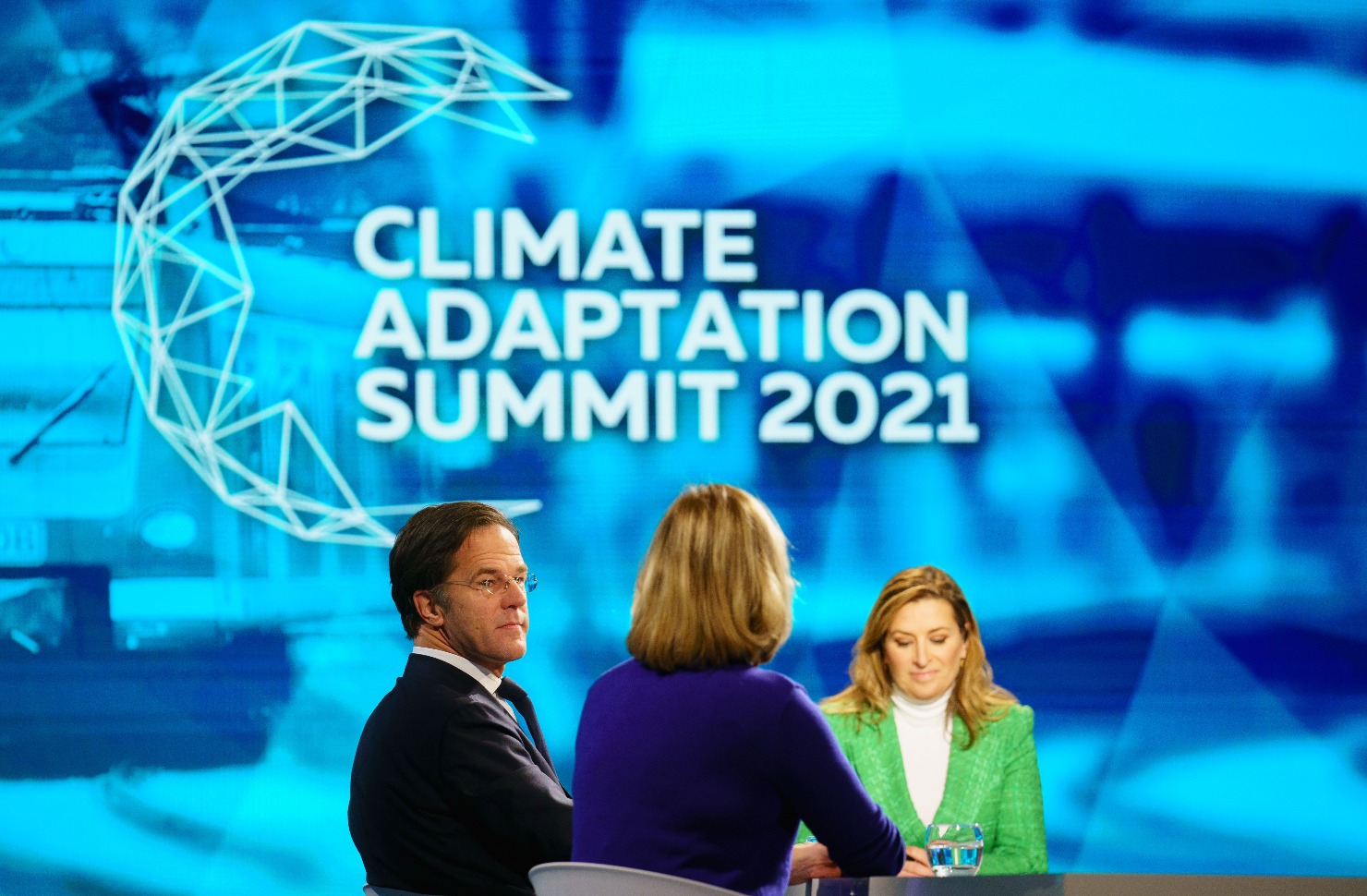 1月25日, 在荷兰海牙,峰会主办国荷兰看守内阁首相吕特(左一)主持首届气候适应峰会。(新华社发)