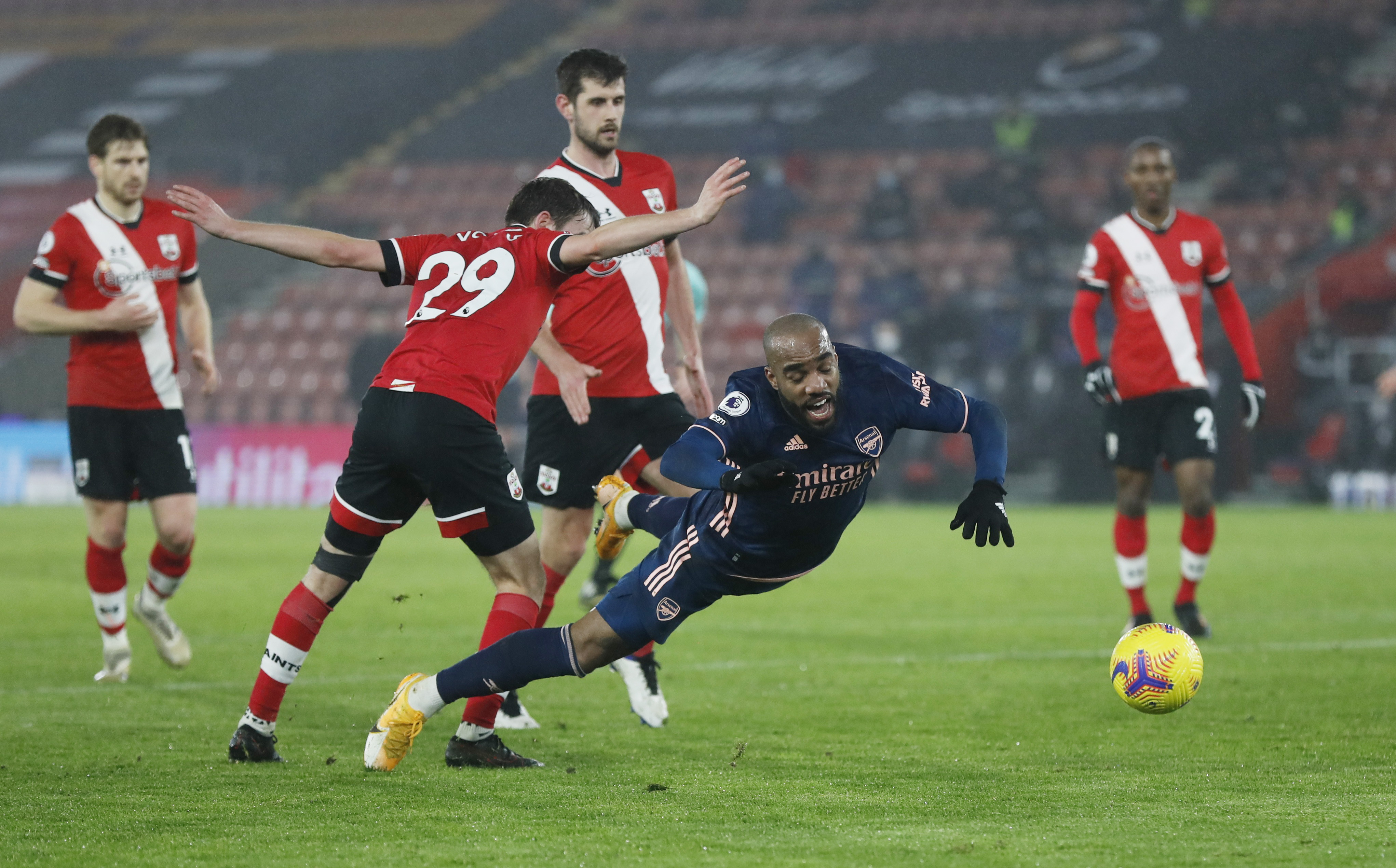 1月26日,阿森纳队球员拉卡泽特(前右)在比赛中和南安普敦队球员沃金斯(左二)拼抢。新华社/路透