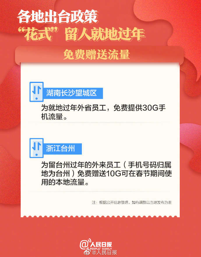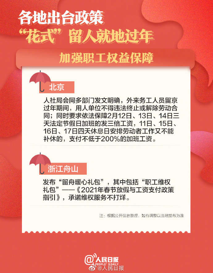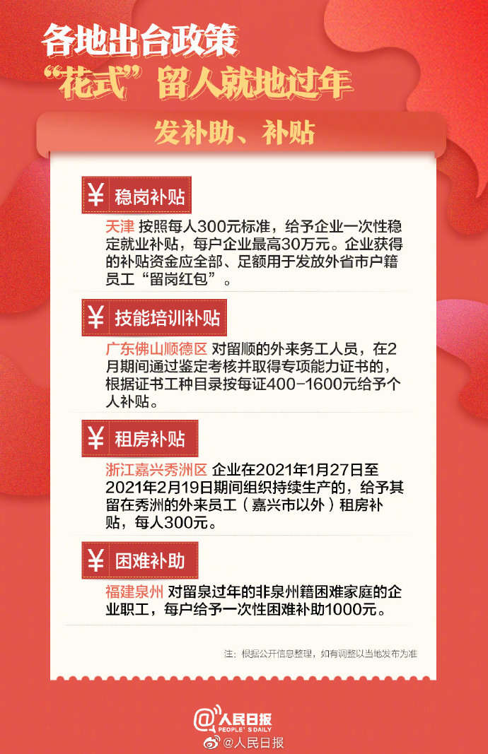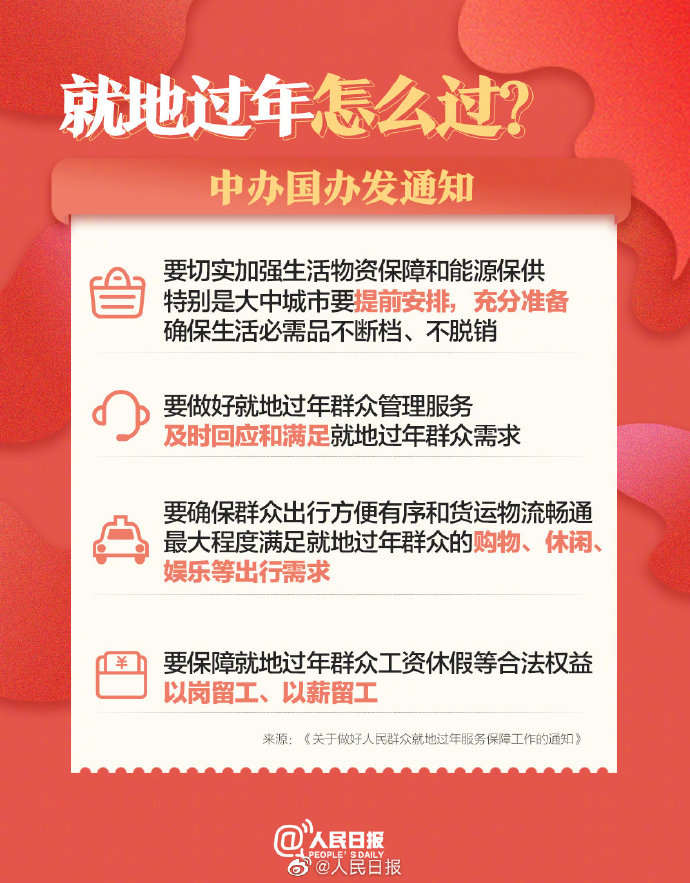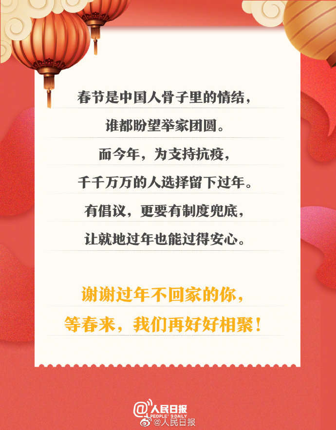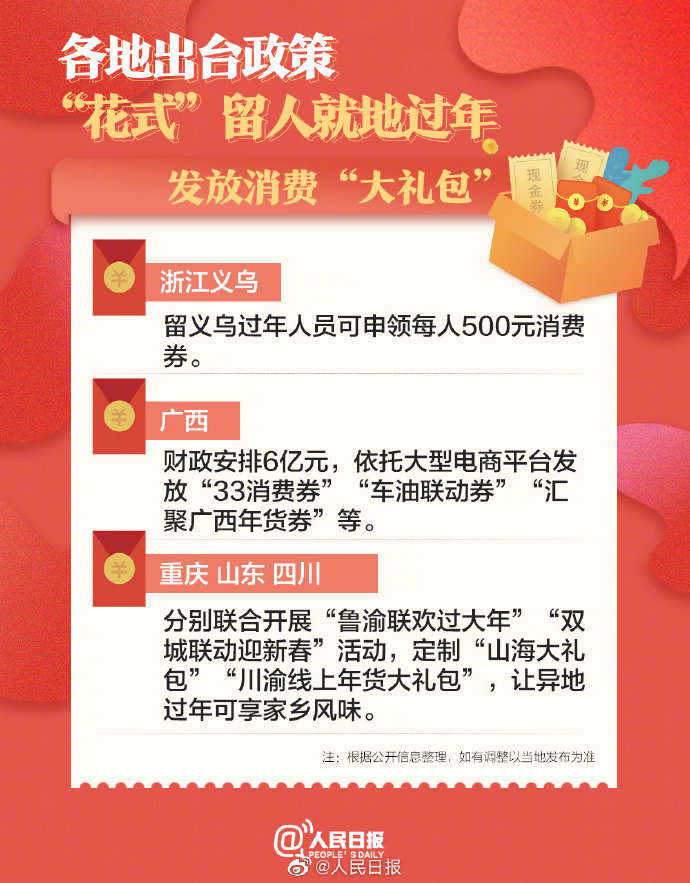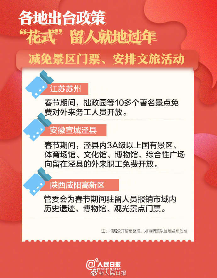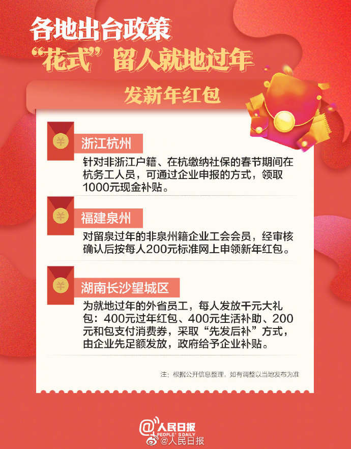 为了疫情防控,今年多地倡议“就地过年”。中办国办日前也印发通知,要求做好人民群众就地过年服务保障。发过年红包、发补助补贴、发消费“大礼包”、减免门票……不少地方出台政策,让就地过年更安心。感谢过年不回家的你,等春来,我们再好好团圆!