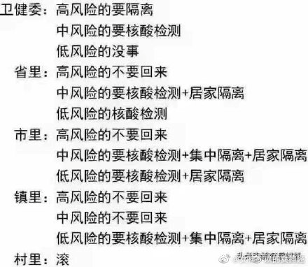 最近网上流传着一张图:中央要求“从低风险区返乡持绿码即可”,到省里却变成“要核酸检测阴性证明”,到市就变成“要居家隔离”,到镇里变成“核酸证明+集中隔离+居家隔离”,到村里变成“禁止返乡”。这张图生动说明了地方防疫政策层层加码的荒唐。