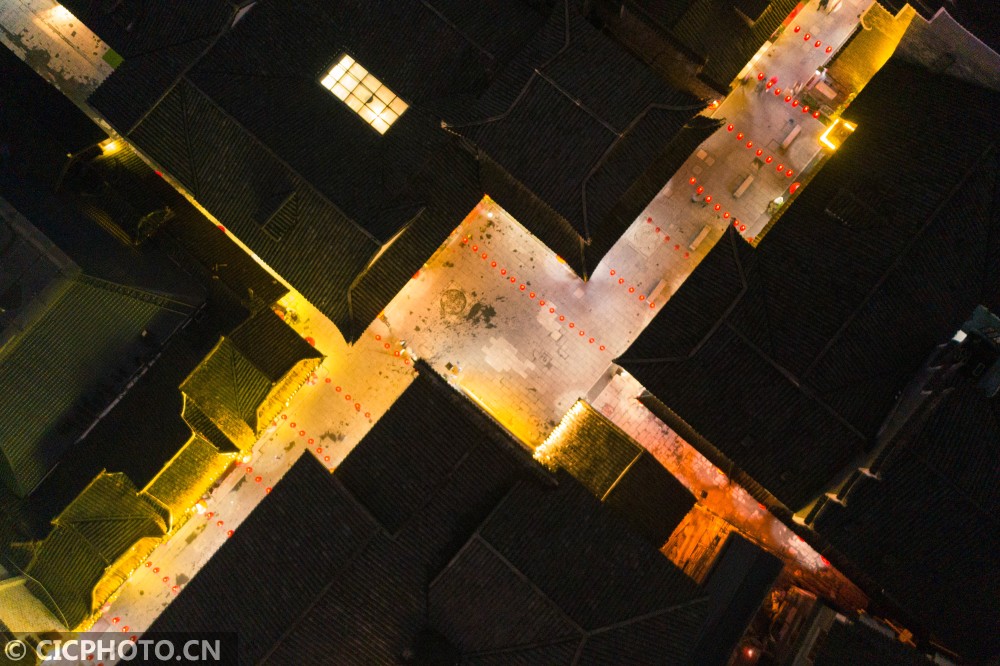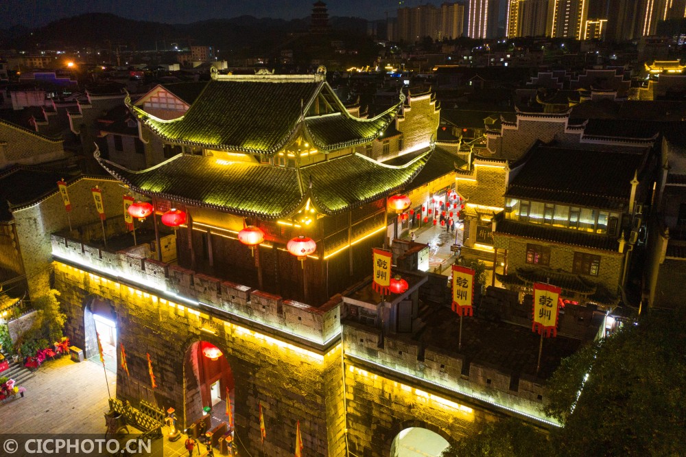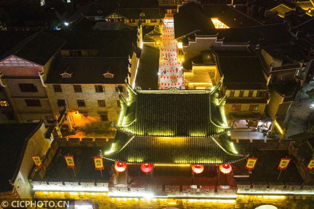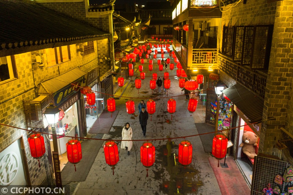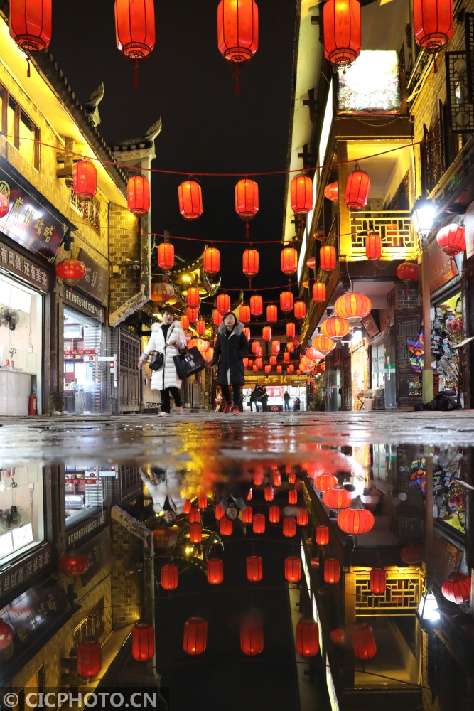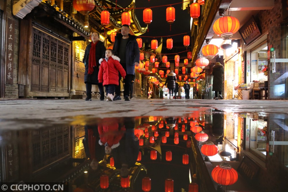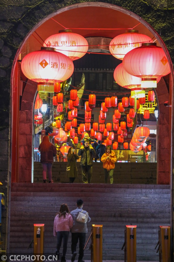 以上图片:2021年1月25日,游客在湖南省湘西土家族苗族自治州吉首市乾州古城景区内游玩、欣赏夜景。CICPHOTO/张术杰 摄
