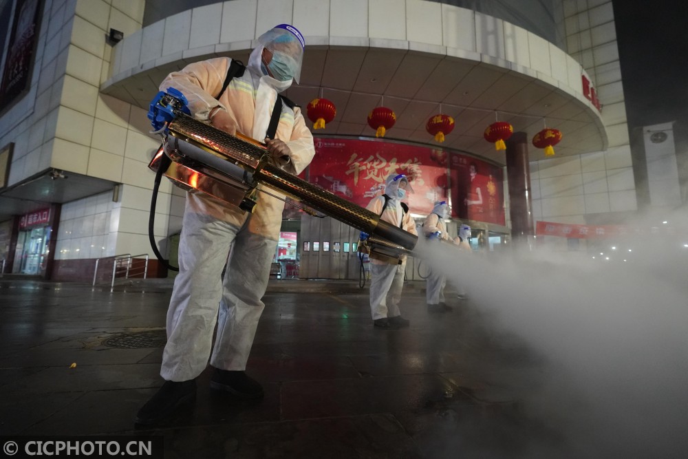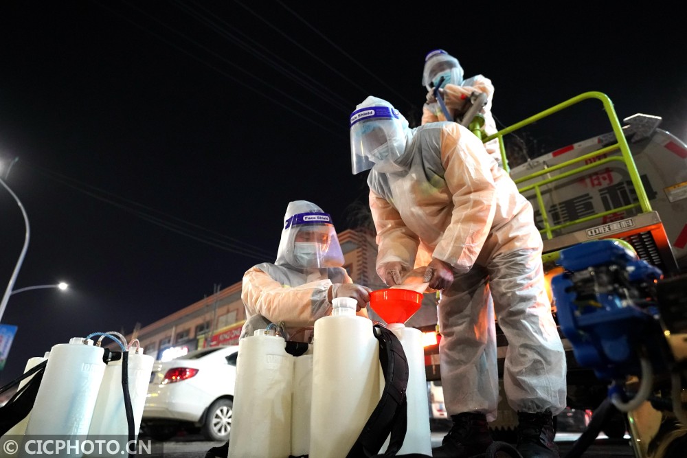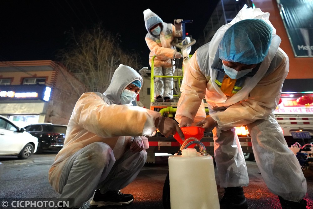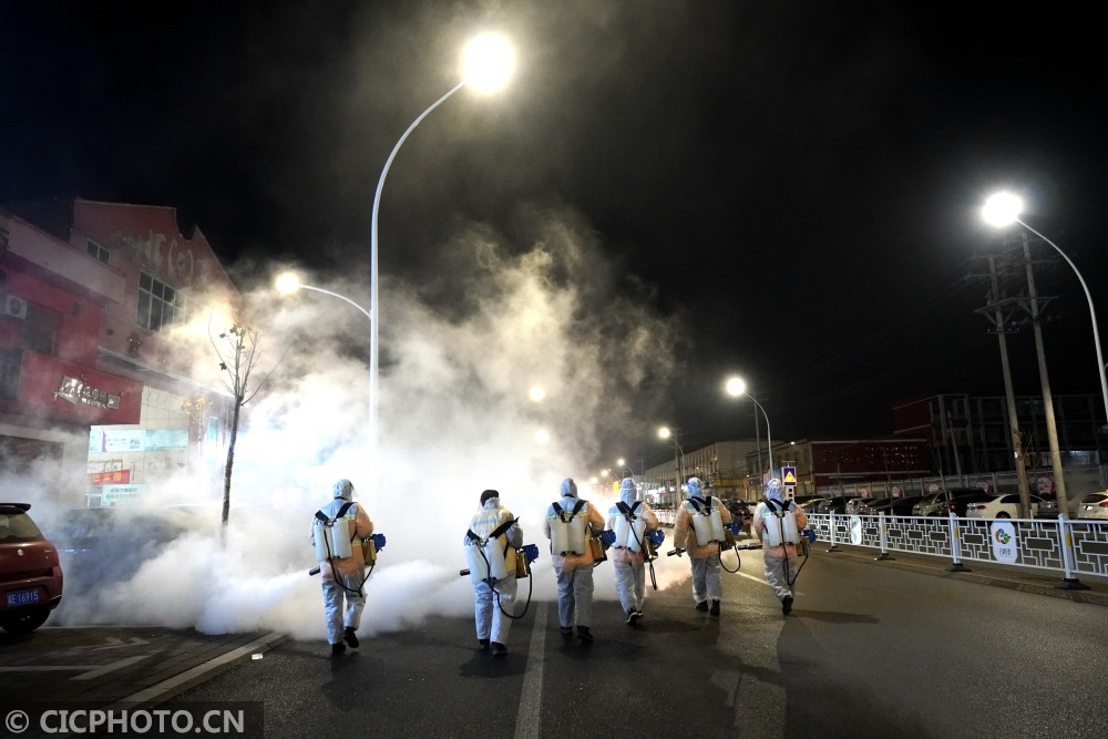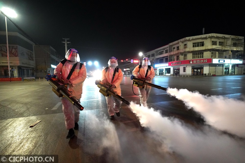 ↑2021年1月26日,河北省邢台市巨鹿县城管局环卫工作人员在街道上进行消杀作业。CICPHOTO/胡良川 摄
