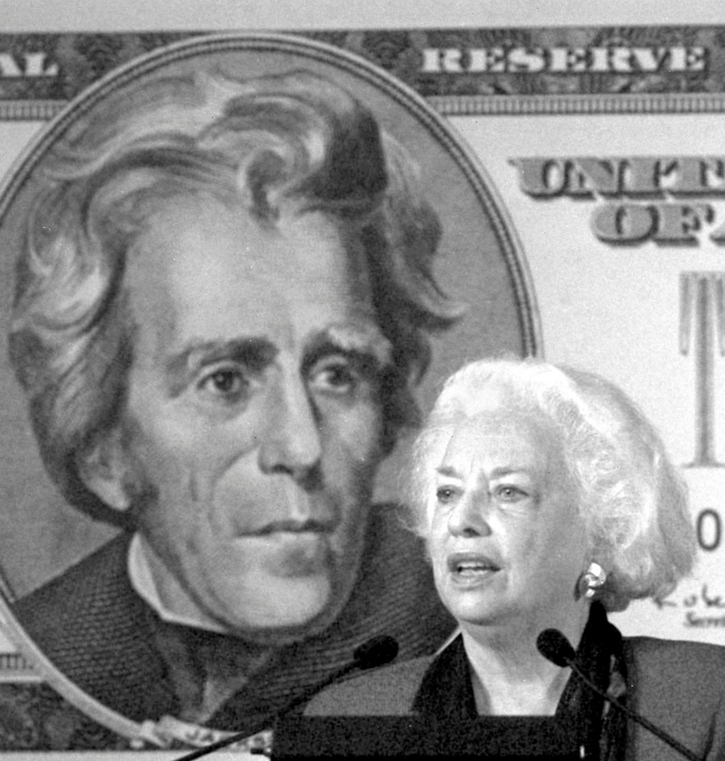 印有杰克逊头像的20美元面值纸钞1998年9月起在美国发行。图为时任美国财政部国库局局长艾伦在华盛顿向媒体宣布新版美元发布的消息。(新华社/美联社)