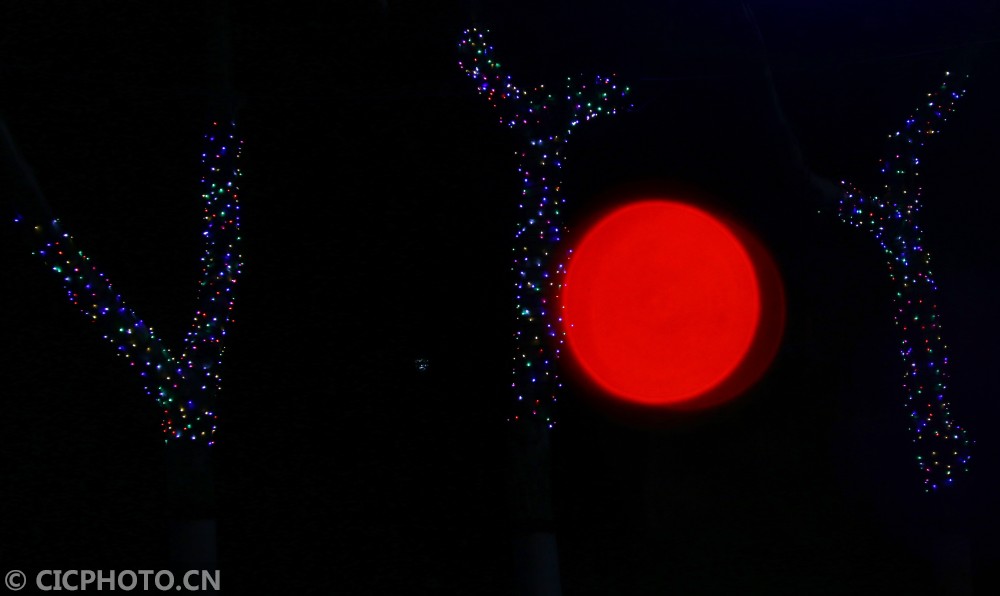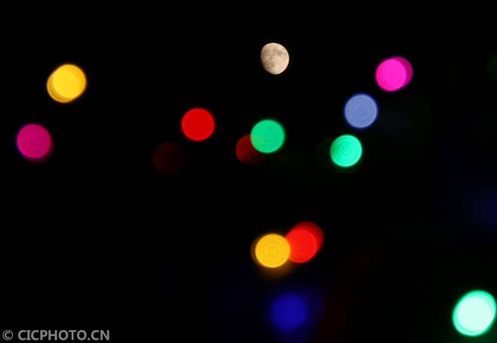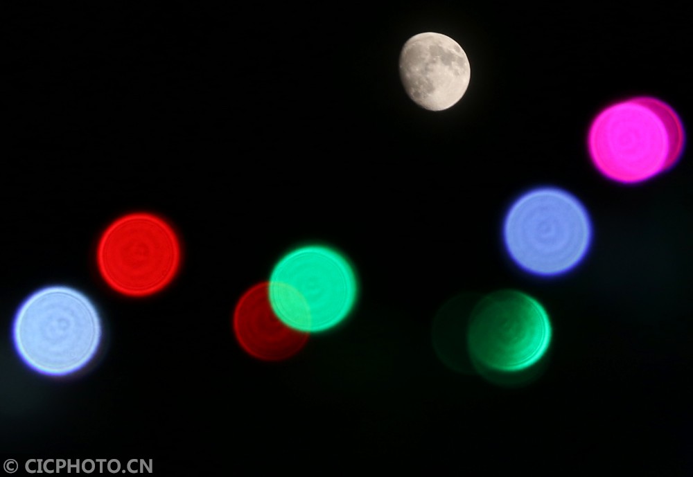 春节临近,河北省邢台市广宗县城区部分树木被装点上了彩色霓虹灯。夜晚,闪烁的霓虹灯既是一道亮丽的风景,也将明月映衬得更加皎洁。