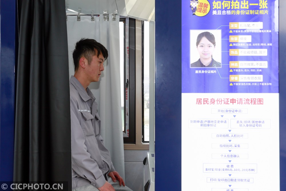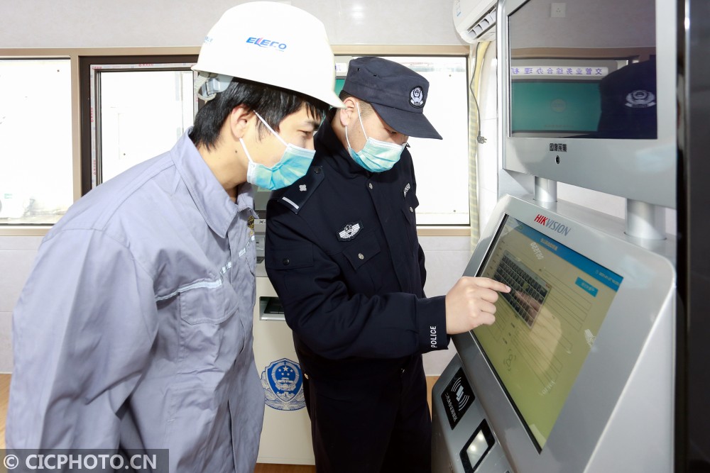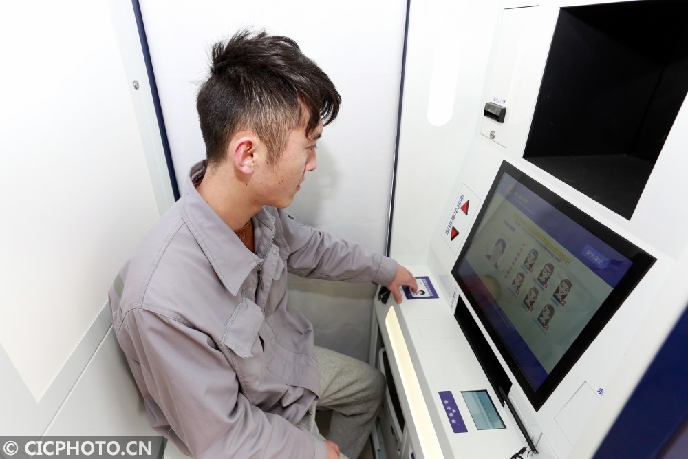 ↑浙江省舟山市岱山县鱼山绿色石化基地24小时无人自助警务超市内,一名工人在办理身份证更换业务。CICPHOTO/邹训永 摄