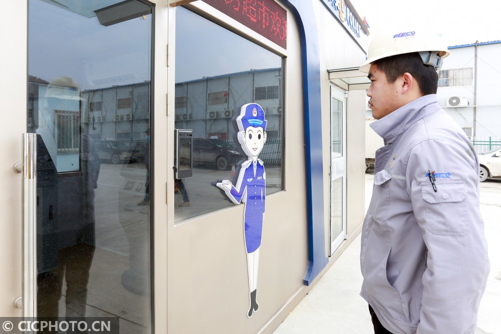 ↑浙江省舟山市岱山县鱼山绿色石化基地内,一名工人在“刷脸”准备进入24小时无人自助警务超市。CICPHOTO/邹训永 摄