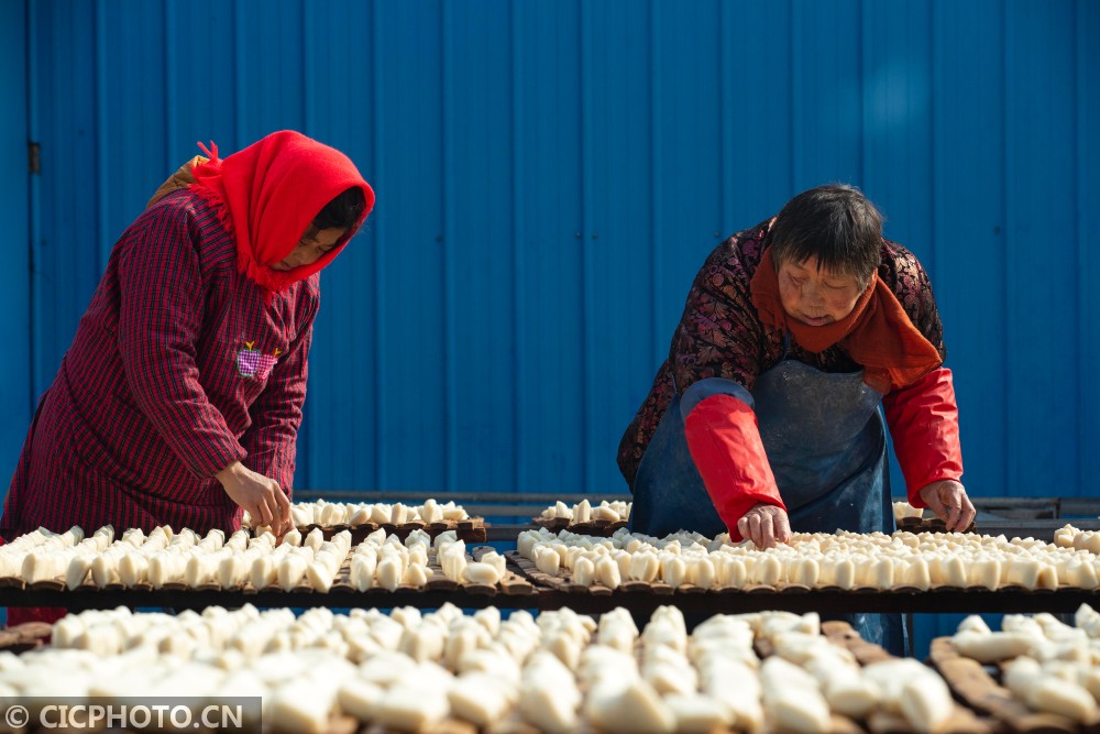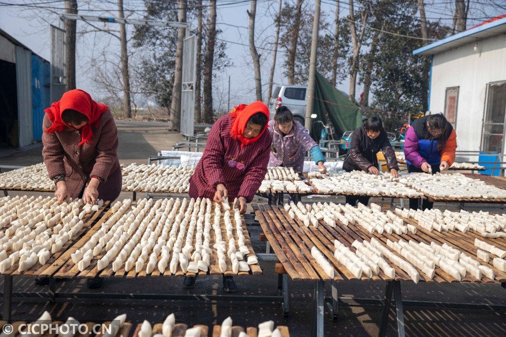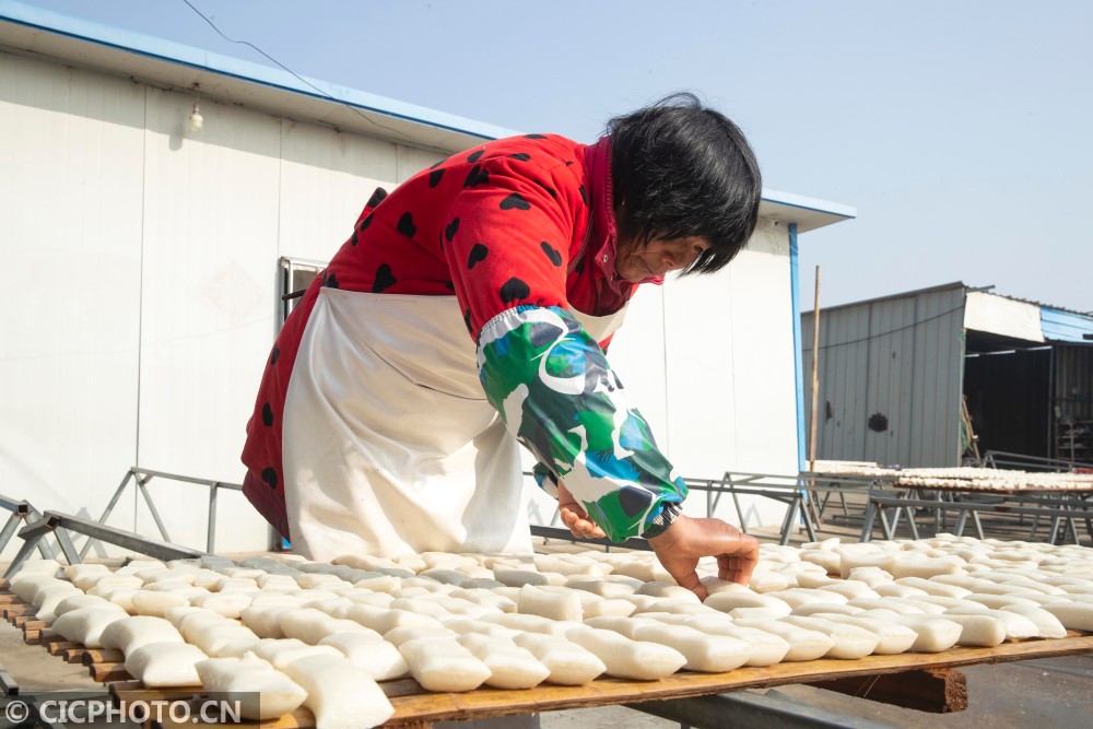 ↑2021年1月27日,江苏省兴化市千垛镇荡朱村村民在翻晒年糕。CICPHOTO/汤德宏 摄