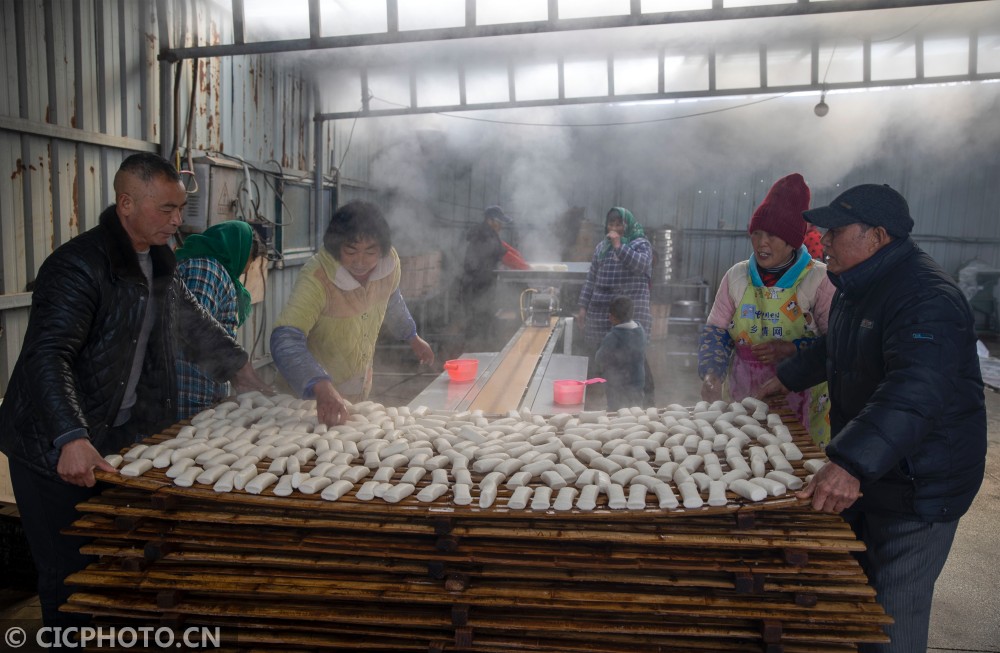 ↑2021年1月27日,江苏省兴化市千垛镇荡朱村村民在制作年糕。CICPHOTO/汤德宏 摄