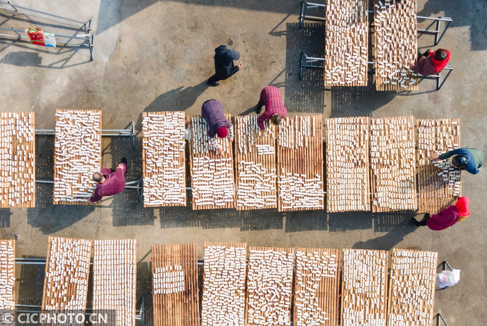 ↑2021年1月27日,江苏省兴化市千垛镇荡朱村村民在翻晒年糕。(无人机照片)CICPHOTO/顾继红 摄