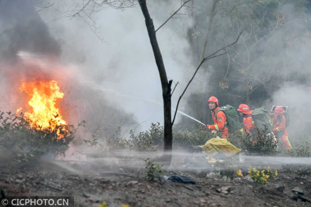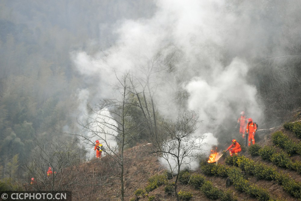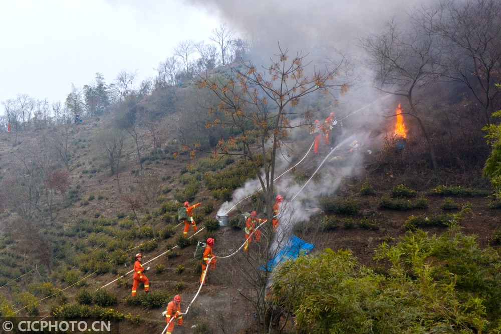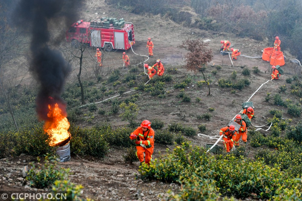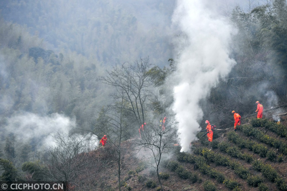 ↑2021年1月25日,在安徽省广德市五龙山国有林场一处“着火点”,浙江省湖州市长兴县森林消防大队队员引水上山、以水灭火。CICPHOTO/谭云俸 摄