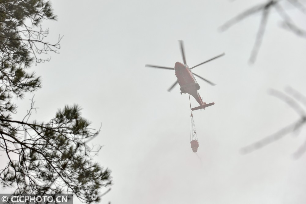 ↑2021年1月25日,在安徽省广德市五龙山国有林场一处“着火点”上空,浙江省应急管理厅航空救援队队员驾驶直升机实施吊桶灭火作业。CICPHOTO/谭云俸 摄