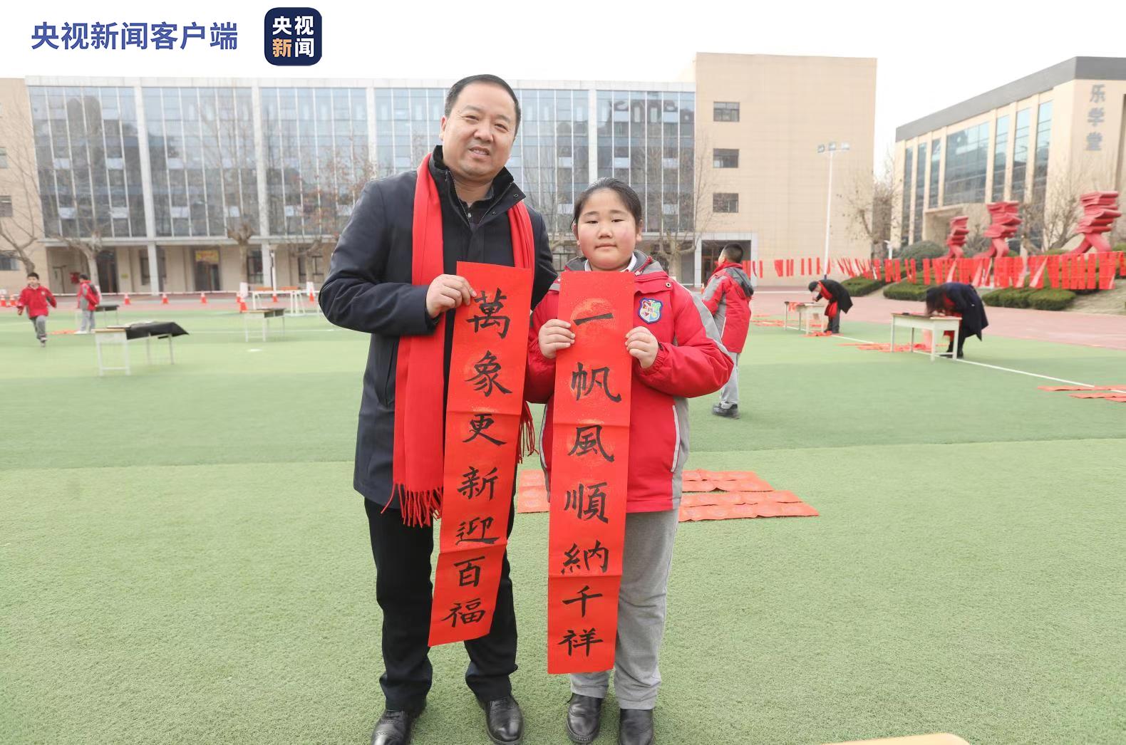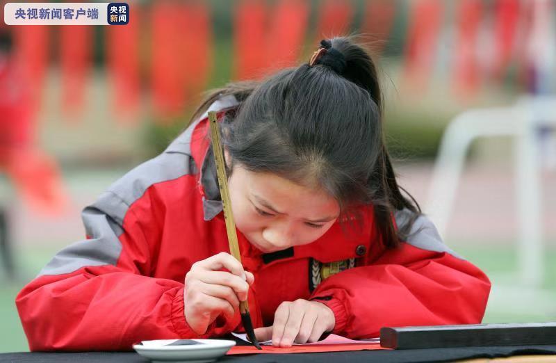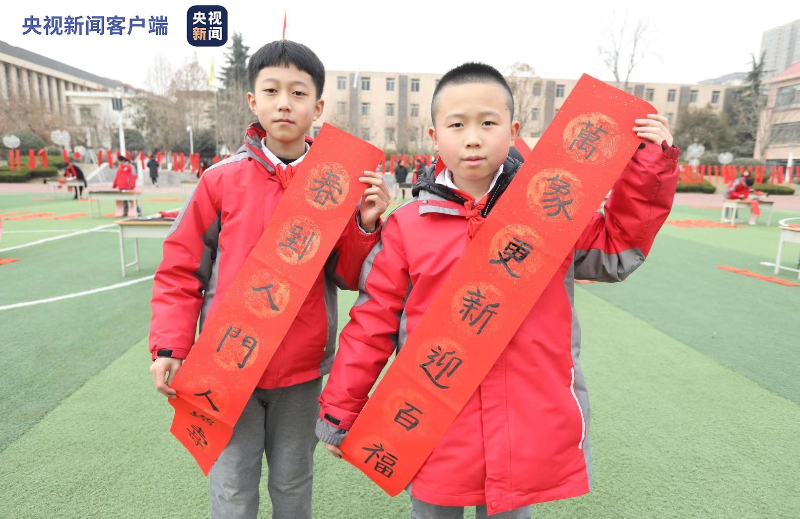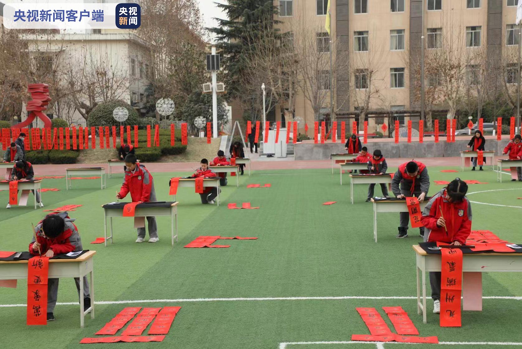 墨香暖童心,寒冬送春暖。临近春节,在陕西西安,300多名爱好书法的小学生和老师在操场上挥毫泼墨,写下近千副春联。