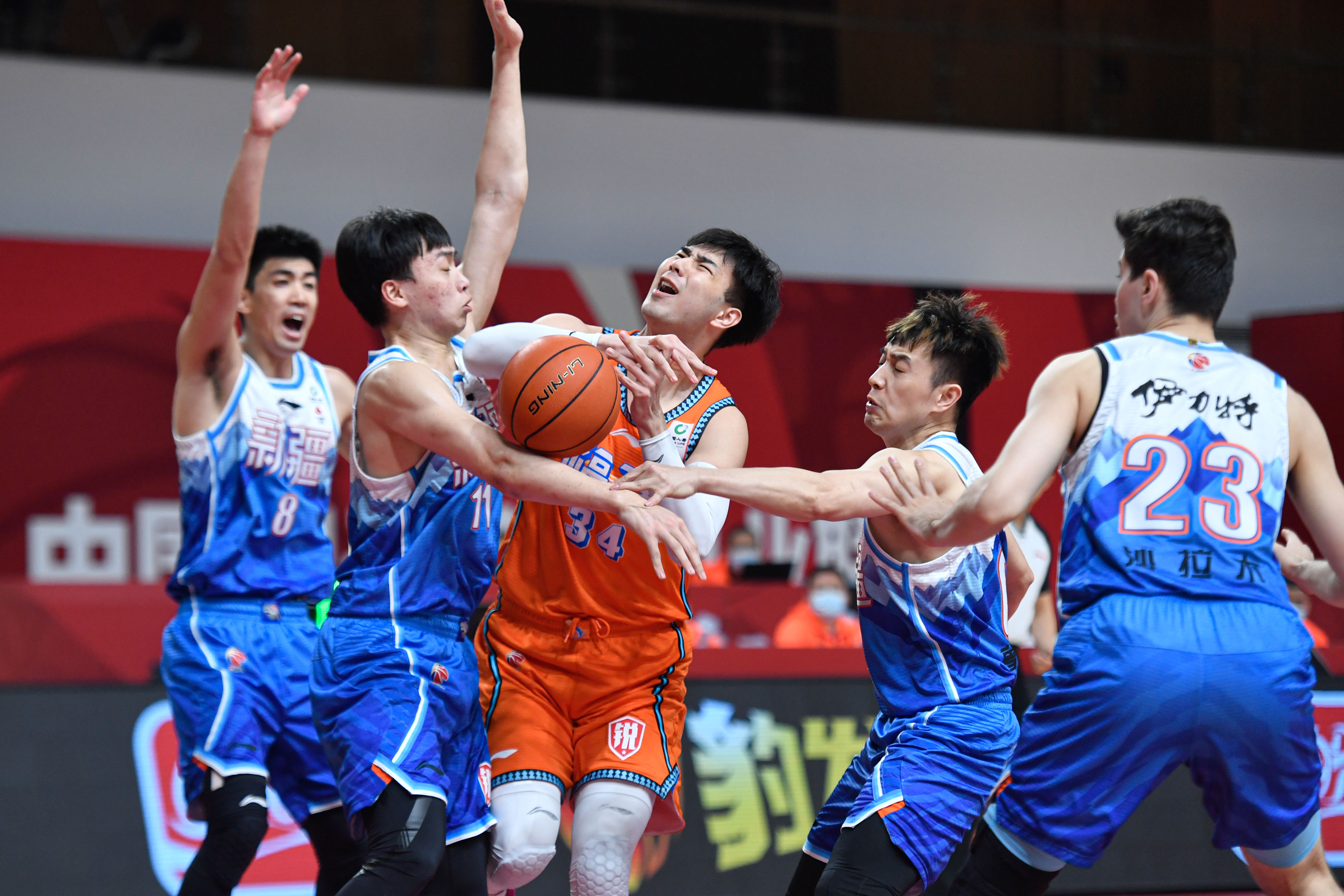 福建队球员黄艺(中)进攻时新疆队球员层层包围。新华社记者黄宗治摄