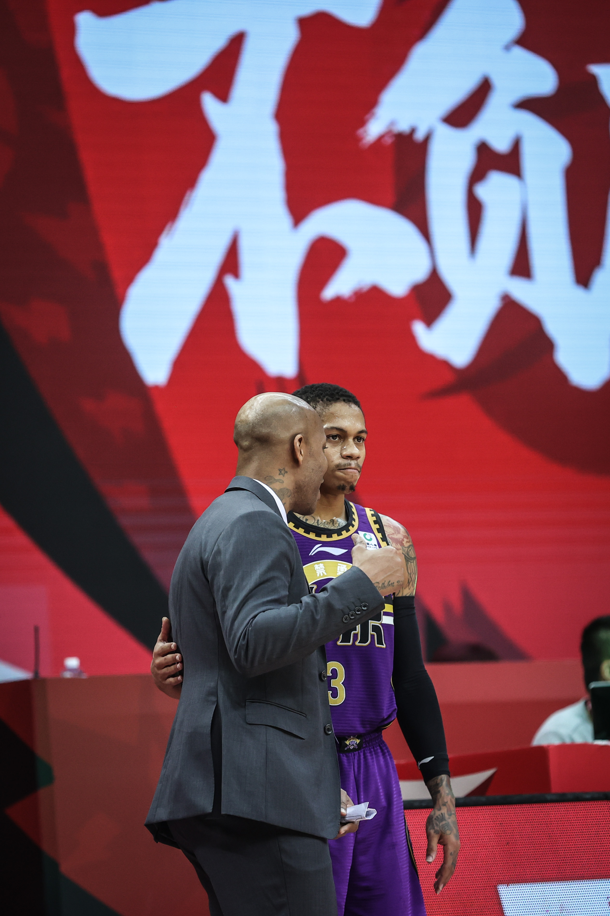 北京队主教练马布里(左)在比赛中与球员约瑟夫·杨交流。新华社记者潘昱龙摄