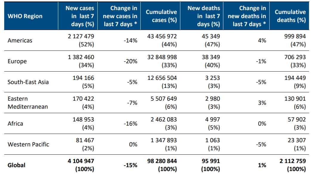 当地时间27日,世卫组织发布的每周流行病学报告指出,70个国家和地区已出现英国发现的新冠病毒变异株,31个国家和地区已出现南非发现的新冠病毒变异株,8个国家和地区已出现巴西发现的新冠病毒变异株。上周全球新冠肺炎确诊病例新增超过410万例,较前一周下降15%。死亡病例新增超过9.5万例,较前一周增加1%。(总台记者 朱赫)