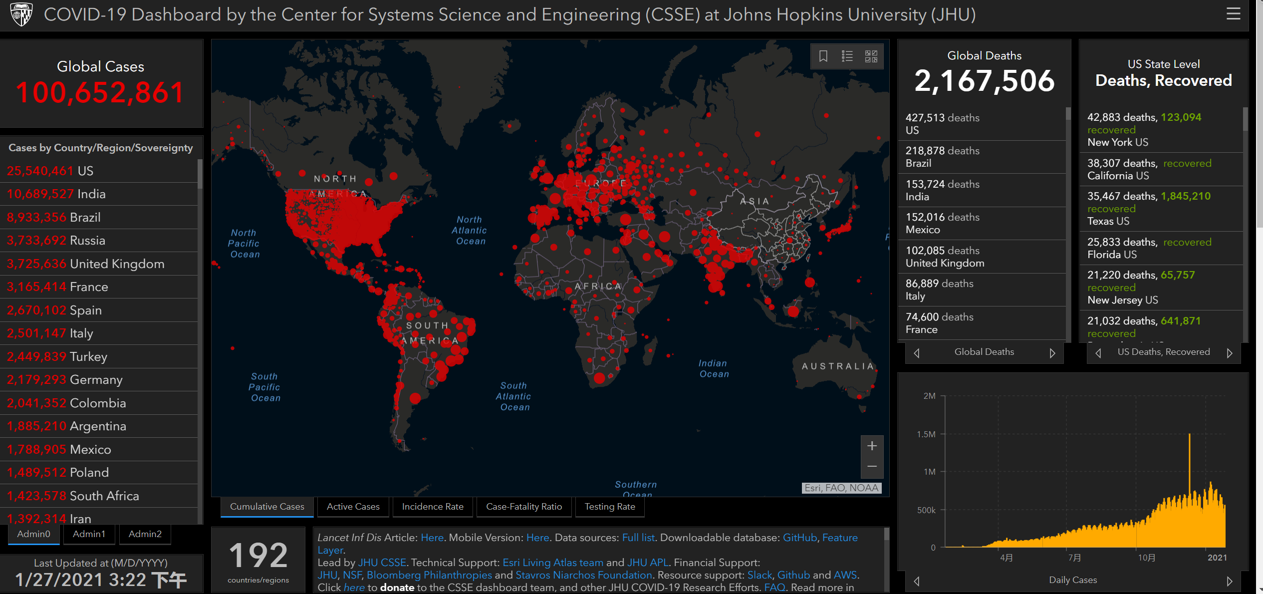根据霍普金斯大学截至美东时间27日15时22分数据,美国全国新冠病毒感染人数达到25540461例,死亡人数达到427513例。