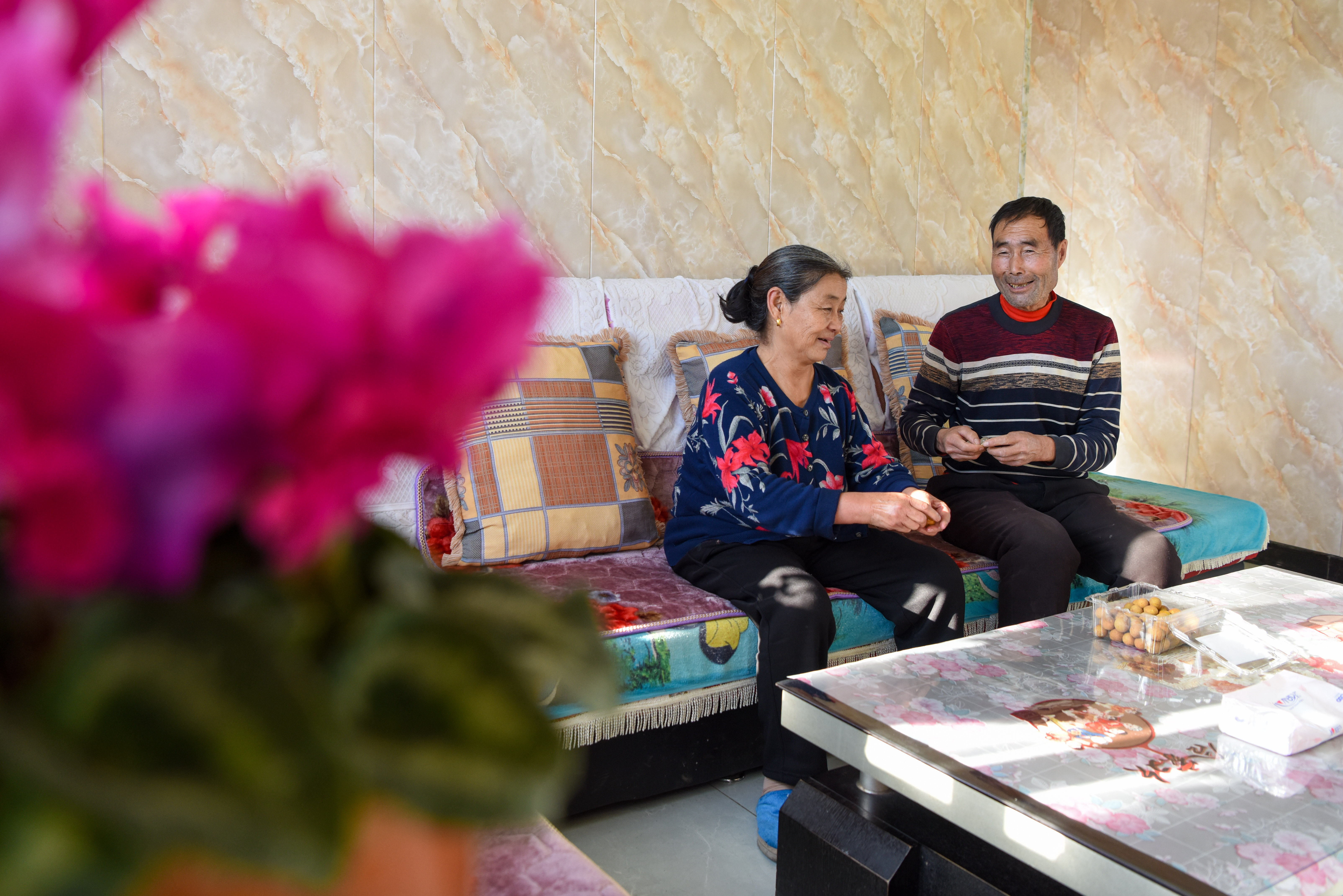 1月21日,在吉木萨尔县头工街东村,村民杨万里(右)和妻子在客厅聊天。新华社记者丁磊 摄