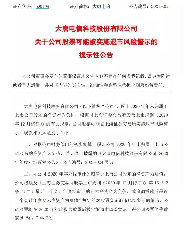 根据《上海证券交易所股票上市规则(2020年12月修订)》的有关规定,如果公司2020年末经审计的归属于上市公司股东的净资产为负值,则大唐电信股票将在2020年年度报告披露后被实施退市风险警示(在公司股票简称前冠以*ST字样)。
