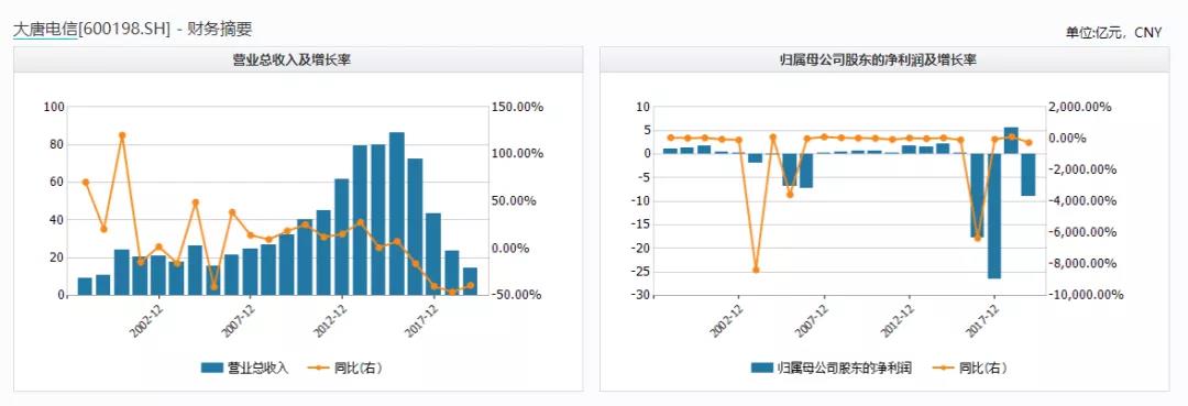 从2015年之后,大唐电信营收开始走下坡路,而净利润为正的2018年,则是为“保壳”通过变卖资产取得的。