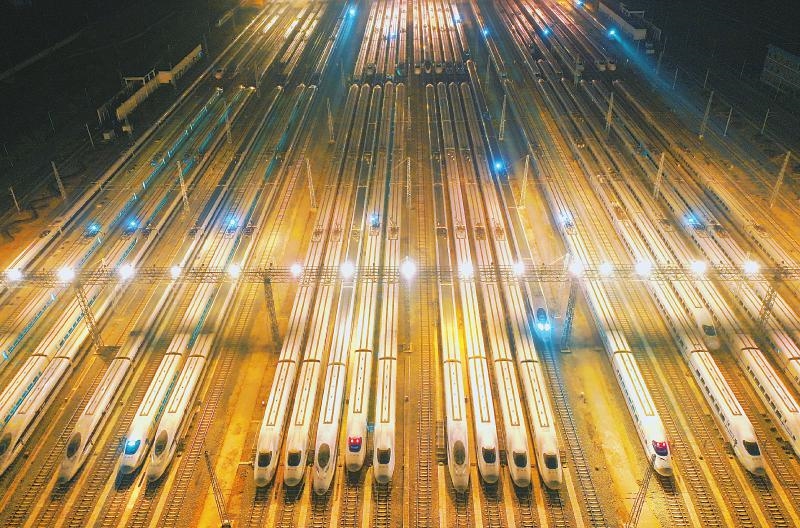 这是1月27日晚在南宁动车所存车线拍摄的检修整备好的动车组列车(无人机照片)。
