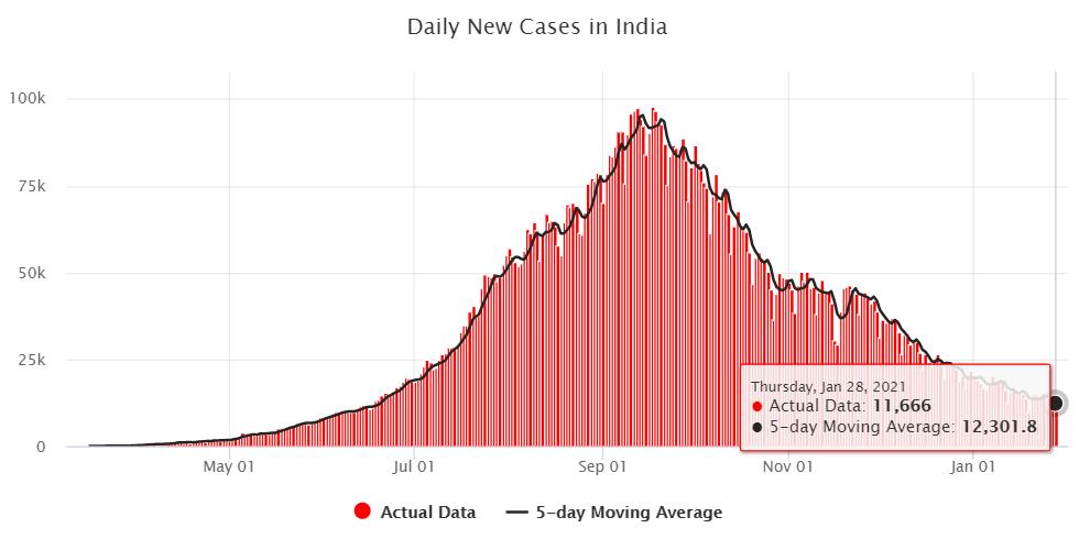 据印度卫生部当地时间28日早8时(北京时间10时30分)发布消息,印度24小时内新增新冠肺炎确诊病例11666例,累计确诊10701193例;新增死亡病例123例,累计死亡153847例;现存确诊病例减少2758例,降至173740例,累计治愈10373606例。
