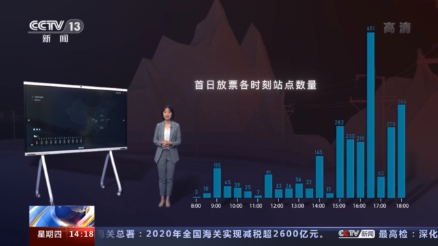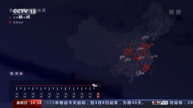 图上的每一个点代表一个火车站,可以看出,全国2700多个车站的放票时间,分布在早8点至晚6点间的21个时间点,每个整点和半点都有新票放出。
