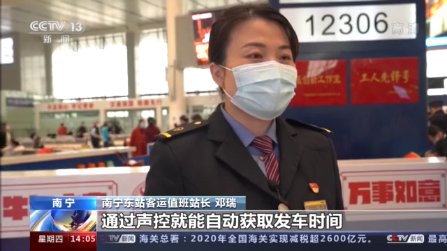南宁东站客运值班站长 邓瑞:我们配备6台12306智能客服机,使用时无需接触,通过声控就能自动获取发车时间、发车时长、检票口位置等信息。
