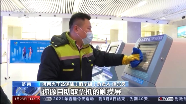 济南火车站保洁(消杀组)负责人 潘兴良:你像自助取票机的触摸屏、电梯的扶手带,包括水龙头开关,旅客使用比较频繁,所以由原来的两小时一次消毒改为现在的一小时一次消毒。