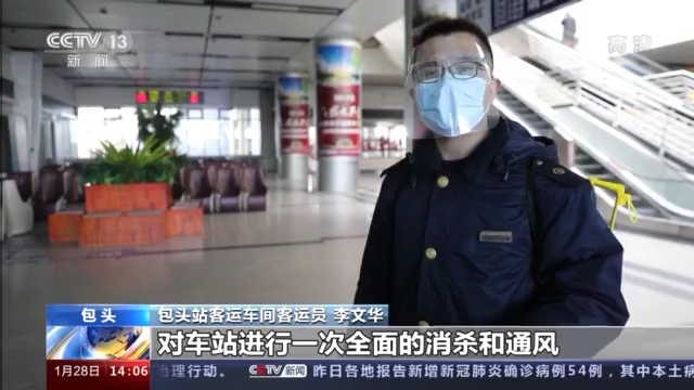 包头站客运车间客运员 李文华:我们现在是每3小时对车站进行一次全面的消杀和通风,对验票的闸机、电茶炉、洗手池面台、卫生间进行擦拭消毒,对候车室的地面和进出站通道喷洒稀释后的消毒液。