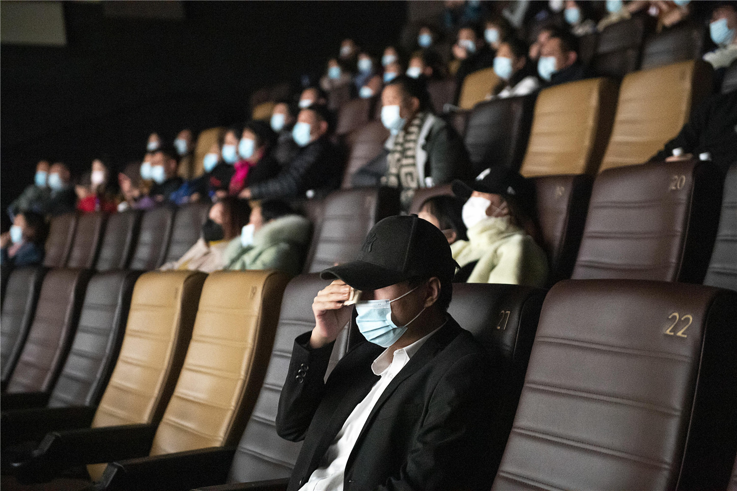 抗疫题材纪录电影《武汉日夜》首映式武汉分会场,一名观众在观影过程中擦拭眼泪。新华社记者熊琦摄