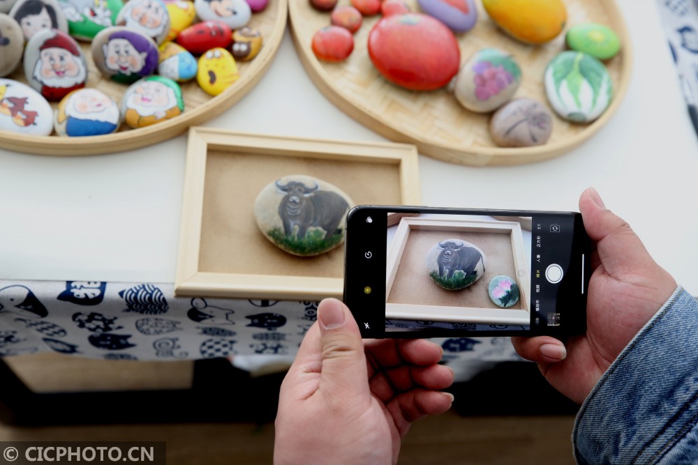 ↑2021年1月25日,江苏省泰州市海陵区梅兰东路一家石头画工作室内,游人在拍摄生肖牛石头画。CICPHOTO/顾俊 摄