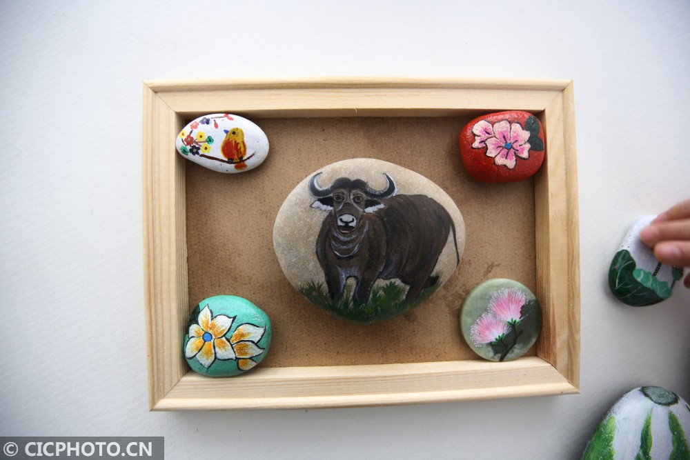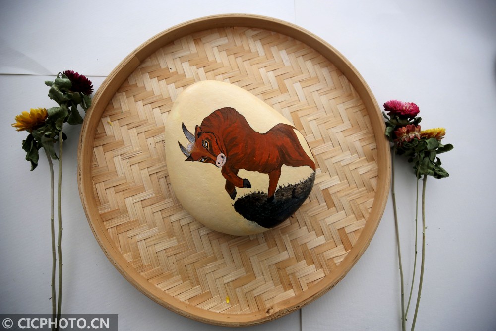 ↑2021年1月25日在江苏省泰州市海陵区梅兰东路一家石头画工作室拍摄的生肖牛石头画。CICPHOTO/顾俊 摄