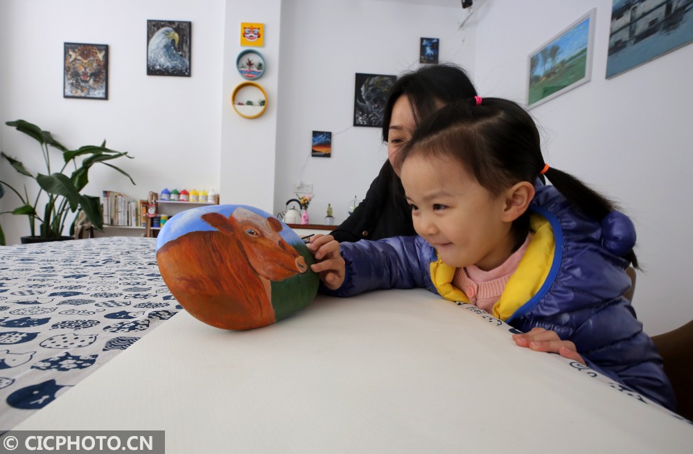 ↑2021年1月25日,江苏省泰州市海陵区梅兰东路一家石头画工作室内,小朋友在观赏生肖牛石头画。CICPHOTO/顾俊 摄