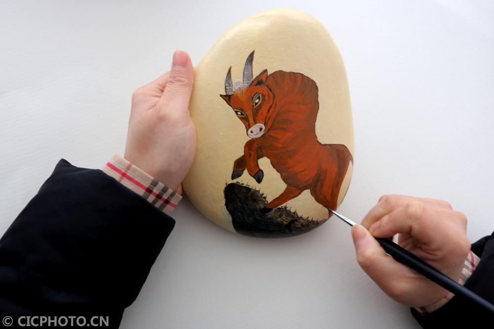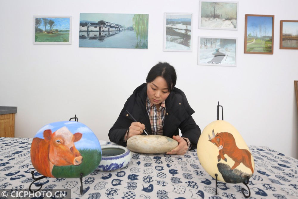↑2021年1月25日,江苏省泰州市海陵区梅兰东路,一家石头画工作室艺人在创作生肖牛石头画。CICPHOTO/顾俊 摄