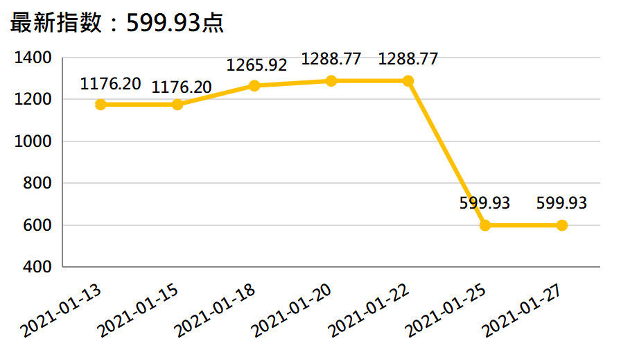 新华财经北京1月28日电(李水艳、李伯罧、薛志烜)新华-中国香蕉产业四大指数显示,截至2021年1月27日,国内香蕉产地价格指数报102.26点,较上一发布日(2021年1月20日,下同)102.26点持平;香蕉销地批发价格指数报106.01点,较上一发布日102.78点上涨3.14%;进口蕉价格指数报908.26点,较上一发布日904.45点上涨0.42%;皇帝蕉产地价格指数报599.93点,较上一发布日1288.77点下跌53.45%。