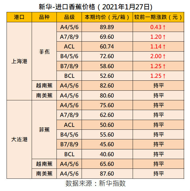 具体来看,产地方面,受前期寒潮影响,产区香蕉受寒,好货供应减少,叠加春节临近市场需求增加,客商备货积极等因素,产区行情有上涨趋势,当前价格仍处于较高位置;销地批发方面,节前市场销售火热,蕉价依然保持上涨趋势;受当前行情及节前市场对高品质香蕉需求增加等因素影响,上海港蕉价持续上涨,大连港受疫情影响交易暂缓,进口蕉价总体维持上涨走势;皇帝蕉方面,前期受寒潮影响产地供应短缺,好货价格大幅上涨,但价高无市,近期产区多为受寒蕉,农户大多低价抛售受寒蕉,皇帝蕉产地价格高位回落。