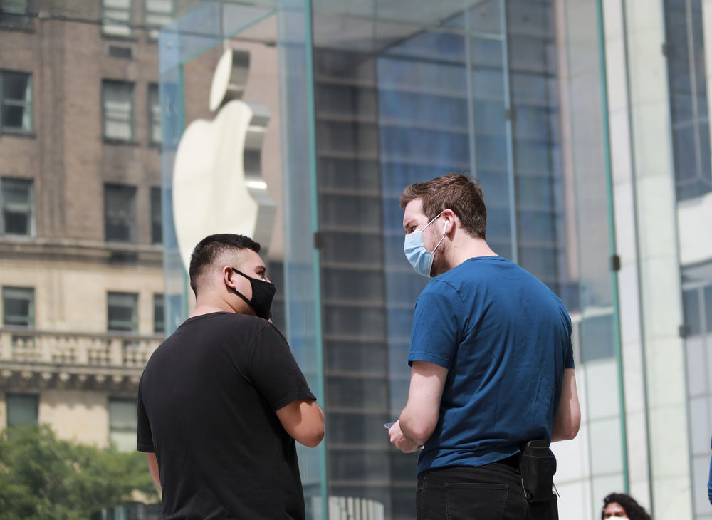 2020年6月17日,在美国纽约第五大道的一家苹果商店外,工作人员与顾客交谈。(新华社记者王迎摄)