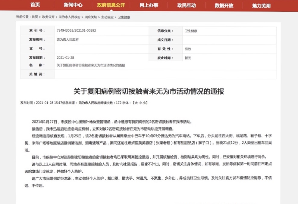 今天(1月28日),安徽省无为市人民政府官方网站发布通报:1月27日,无为市疾控中心接到外地协查管理函,函中通报有复阳病例的2名密切接触者在无为市活动。接函后,无为市迅速启动应急响应机制,立即对该2名密切接触者在无为市活动轨迹开展调查。