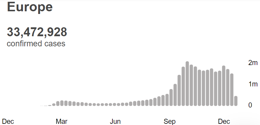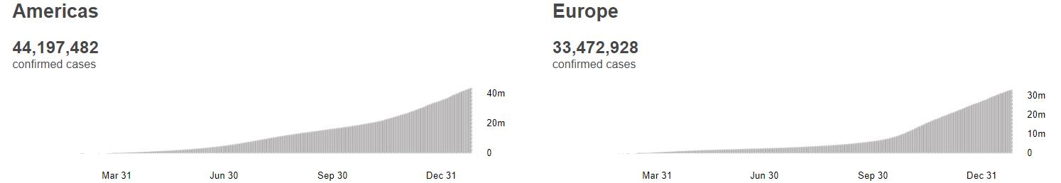 与全球今日确诊病例超过1亿例类似,任何国家、地区确诊病例的高企都不是一朝一夕。当时间回到2020年4月3日,全球新冠肺炎确诊病例超过100万例时,全球疫情最为严峻的地区还是欧洲。