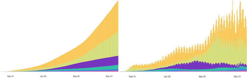 △全球新冠肺炎确诊病例累计变化曲线图(左)全球新冠肺炎单日新增确诊病例变化曲线图(右)世卫组织统计数据显示,自10月下旬开始,全球新冠肺炎确诊病例增速开始加快。通过左侧累计变化曲线图可以明显看出,9月30日之后,全球新冠肺炎确诊病例曲线图的斜率愈来愈大。