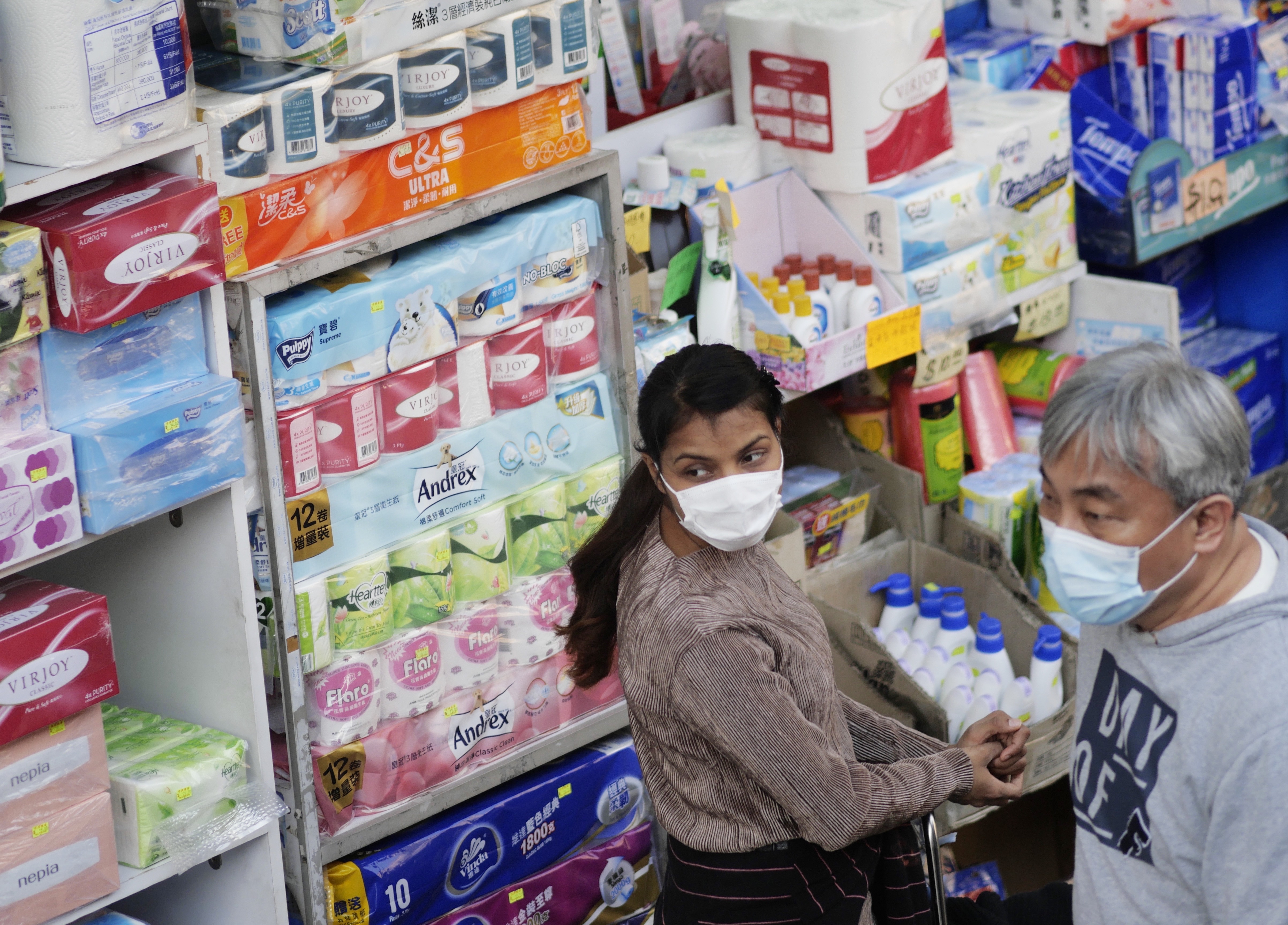 图为1月28日,戴口罩的市民在香港土瓜湾一家商店。新华社记者 王申 摄