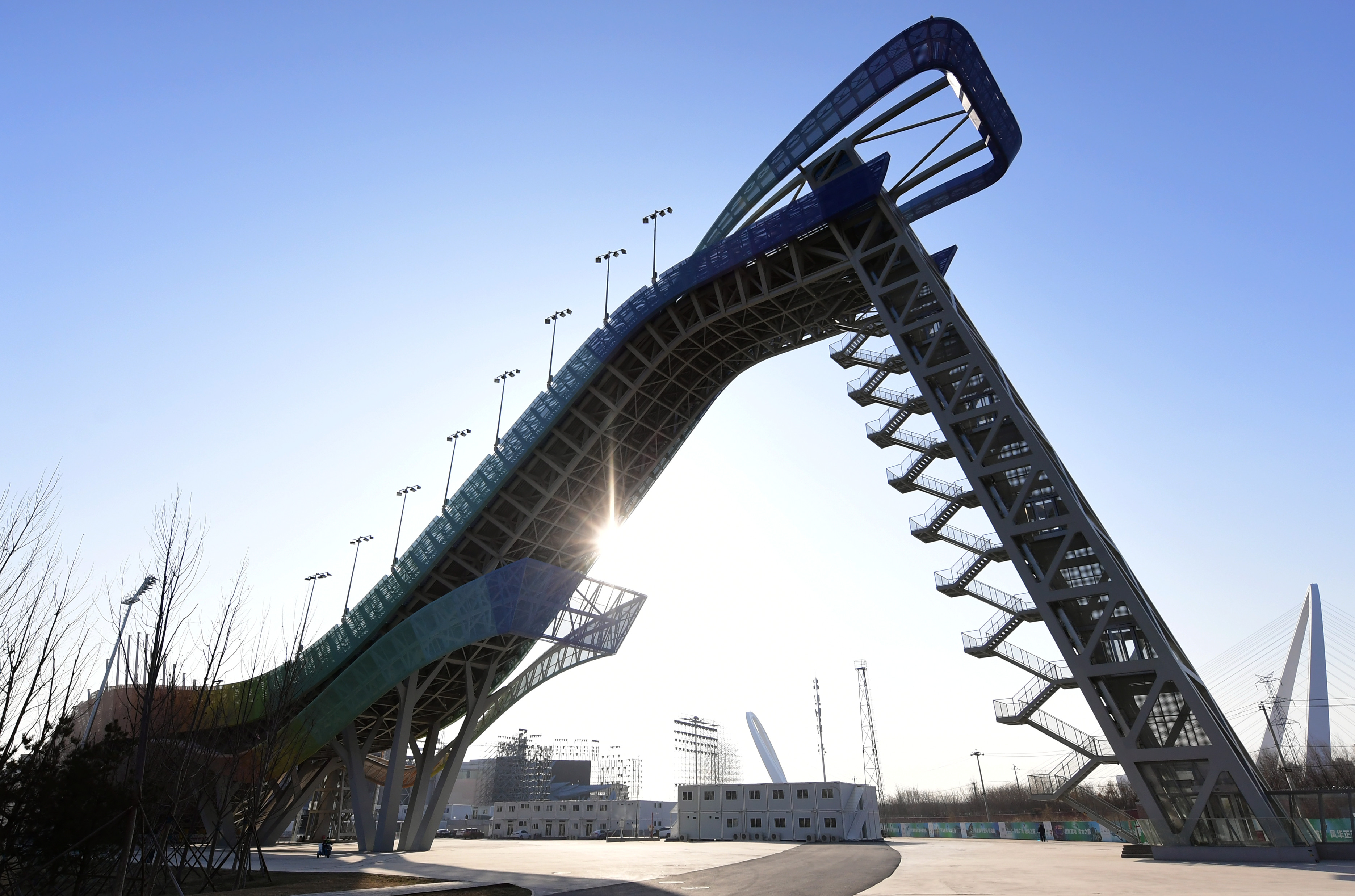 首钢滑雪大跳台在冬日蓝天映衬下英姿尽显。首钢滑雪大跳台作为2022北京冬奥会跳台滑雪比赛项目的正式比赛场地,赛时将在此产生4块金牌,冬奥会后还将成为永久性保留和使用的滑雪大跳台场馆,成为专业体育比赛和训练场地,并面向公众开放用于大众休闲健身活动。新华社记者张晨霖摄