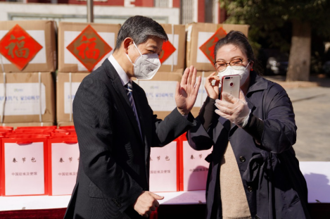在“春节包”发放仪式现场,中国驻埃及大使廖力强与旅埃留学生代表蔡钟倩的国内家人进行了视频通话,并致以新春祝福。代表旅埃侨胞领取“春节包”的埃及中国华人华侨联合会会长陈建南表示,使馆发放的“春节包”为在埃华人疏解了身居海外抗击疫情、思念亲人的焦虑情绪。