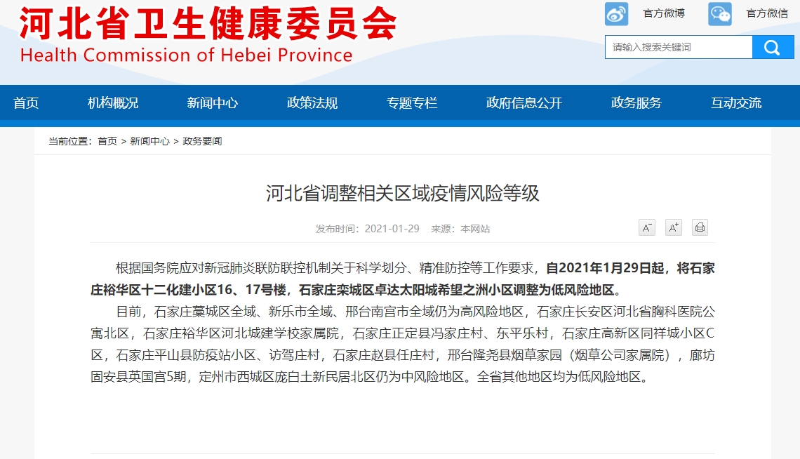 根据国务院应对新冠肺炎联防联控机制关于科学划分、精准防控等工作要求,自2021年1月29日起,将石家庄裕华区十二化建小区16、17号楼,石家庄栾城区卓达太阳城希望之洲小区调整为低风险地区。