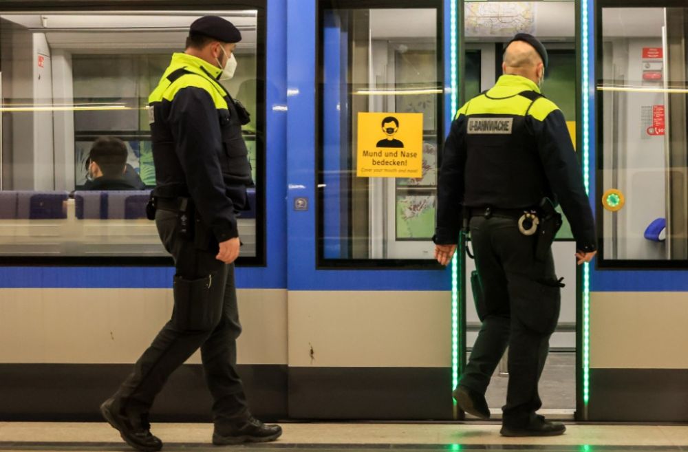 1月15日,在德国慕尼黑,戴口罩的地铁安保人员进入地铁车厢。(新华社发,菲利普·鲁伊兹摄)