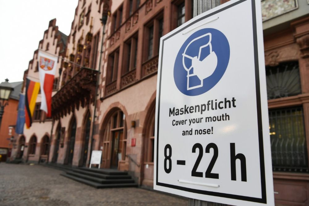 1月20日在德国法兰克福罗马广场拍摄的一处提醒人们佩戴口罩的警示牌。(新华社记者逯阳摄)