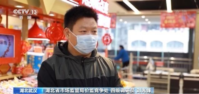 湖北省市场监管局价监竞争处四级调研员 刘光锋:一个是督促全省各级监管部门深入一线,到商场、超市、农贸市场,对老百姓必须的米、面油、肉、蔬菜以及必备的防疫物资、口罩、酒精、消毒用品,进行全面的市场巡查监管。